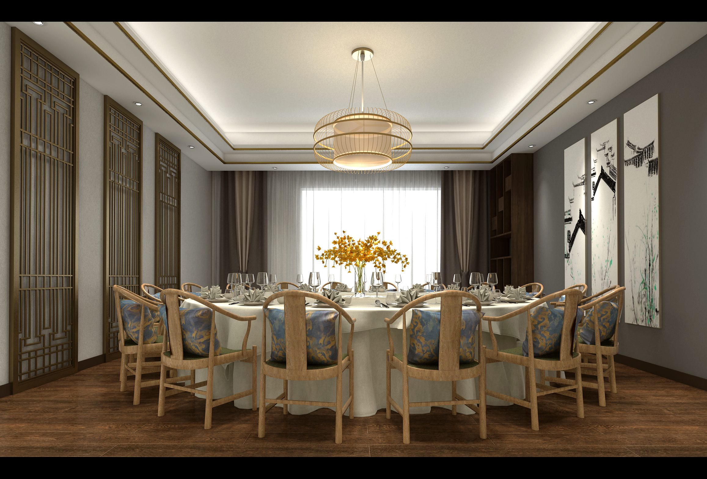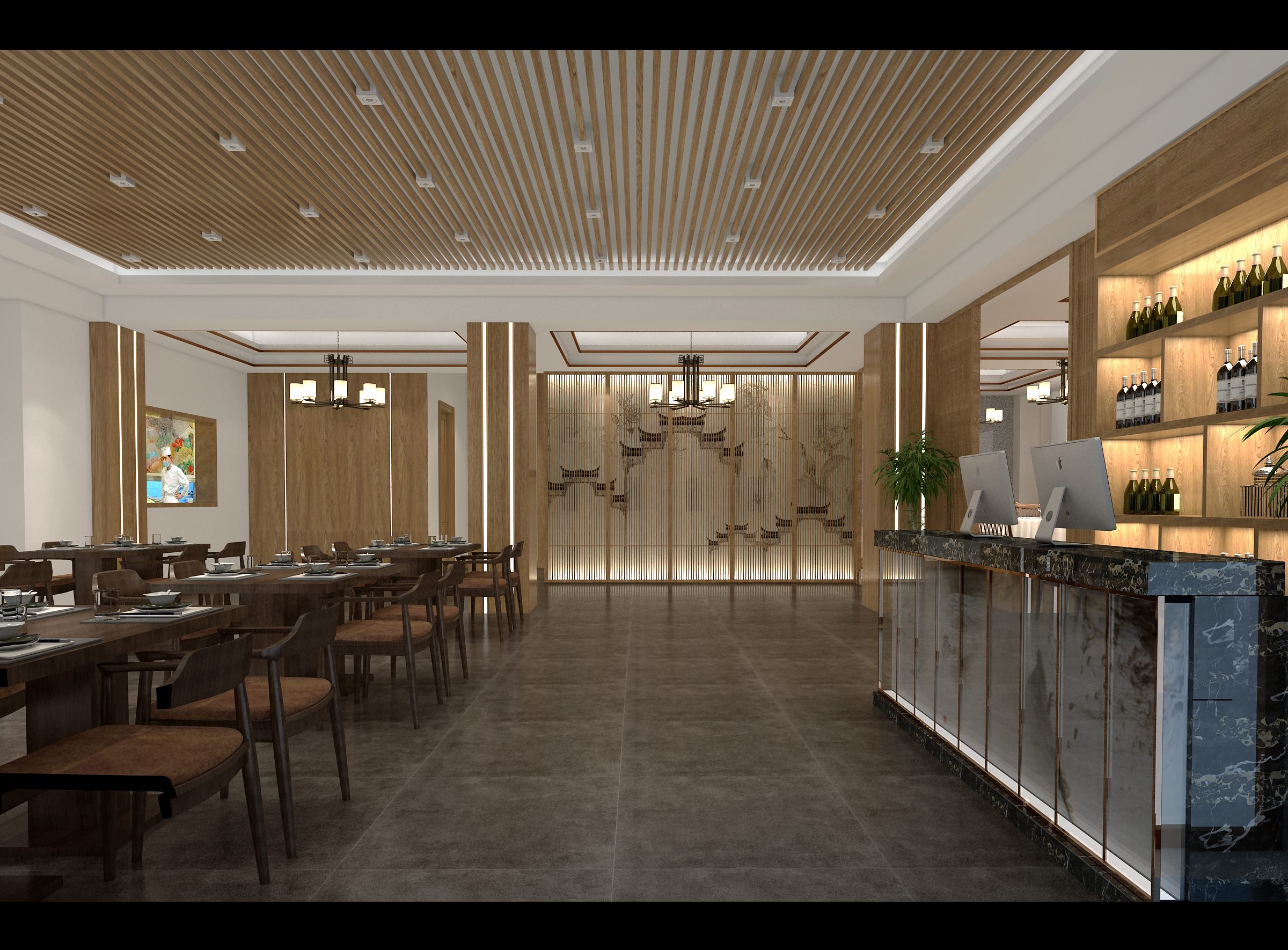 項目介紹:紅杉食府的店里采用了新中式的裝修風格。其中,餐廳包廂設計尤為亮眼,有燈槽四邊吊頂配以古色古香的吊燈,烘托出高雅別致的用餐氛圍,木質桌椅配以山水畫裝飾,更顯古典韻味。當顧客來此用餐,想必也能充分感受到自己是貴賓,被如此禮遇。