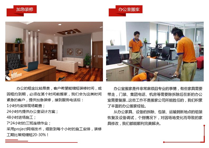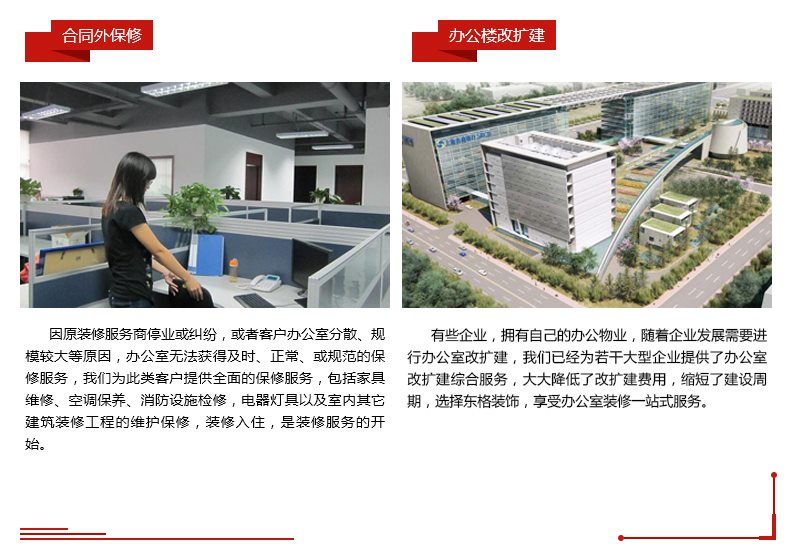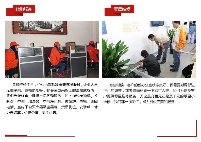 辦公室裝修有些服務內容,客戶非常需要,但是因為沒有收益,或者服務成本太高,一般裝修企業不提供, 這些服務就是我們所提供的配套服務,包括“辦公室租前勘查、 辦公室收房退房協助、加急裝修、辦公室室內 配飾、企業識別系統及LOGO設計制作、代購服務、零星局部小維修、辦公室搬家、合同外保修、辦公樓改擴建” 等。配套服務,解決了辦公室裝修設計客戶的一些特殊的細小服務需求,也為本企業增加了有特色的競爭優勢。  | |